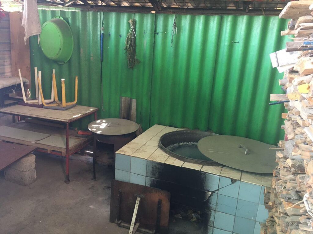 При осмотре территории в углу заметили кухню с большим казаном. Мужчина пояснил, что готовит плов на мероприятия для махалли и поклялся, что не резал и не держал здесь животных. А этих двух собак он взял, чтобы спугнуть кошек.