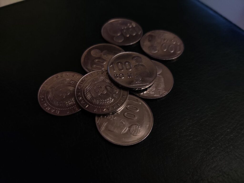 Денежный знак Центрального банка в виде монеты достоинством 1000 сум изготовлен из двухцветной комбинации: внутреннее кольцо желтого цвета из меди и латуни, внешнее кольцо серебряного цвета с никелевым покрытием.