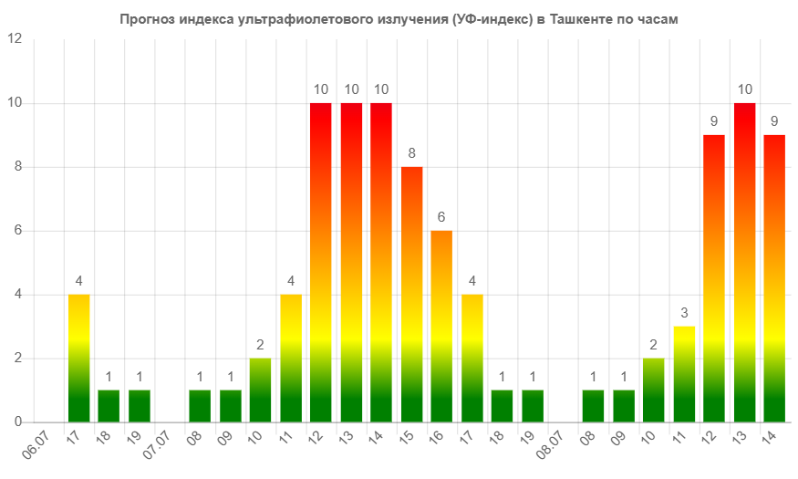 Meteonova ma’lumotlariga ko‘ra, 7-iyul kuni Toshkent kuchli ultrabinafsha nurlanish bilan qoplanadi.