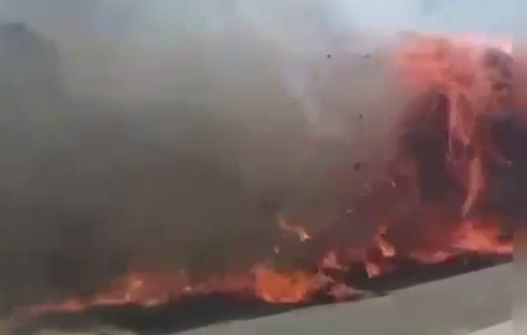Водитель ехал с тремя прицепами, загруженными тюками сена. В какой-то момент груз вспыхнул, но водитель невозмутимо продолжил движение, оставляя после себя след из черного дыма и кусков горящего сена, которые падали на дорогу.