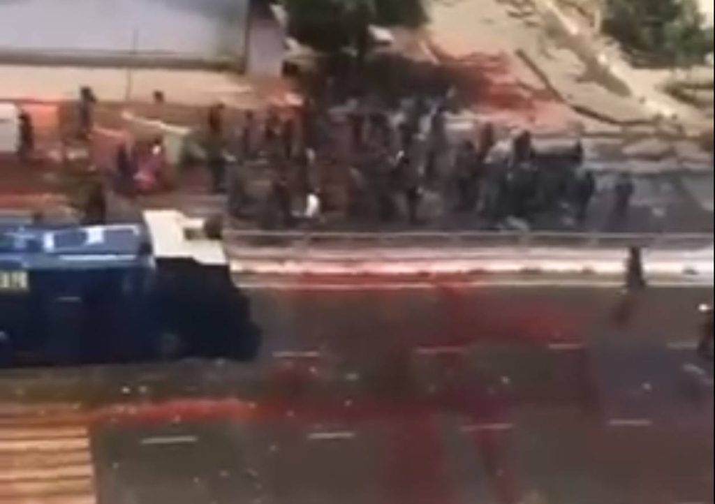 Видео распространилось в соцсетях, но позже выяснилось, что красные пятна на дорогах образовались из-за водометов: митингующих разгоняли подкрашенной в оранжевый цвет водой.