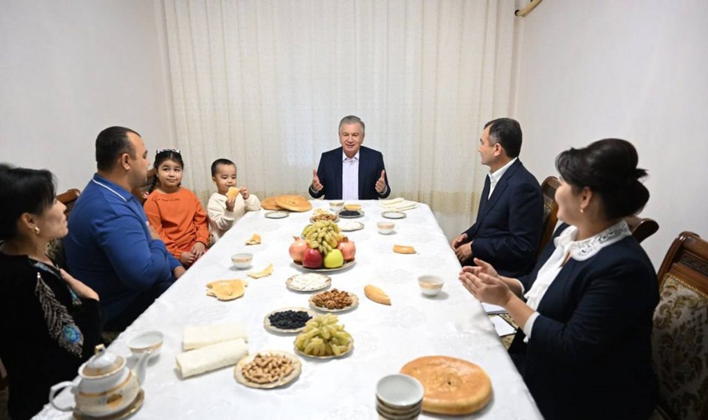 Также Шавкат Мирзиёев зашел в гости к местному жителю Дилшоду Набиеву, который вместе с супругой Хурриятхон воспитывает двоих детей. Президент побеседовал с семьёй за пиалой чая, перед уходом подарил детям ноутбуки.