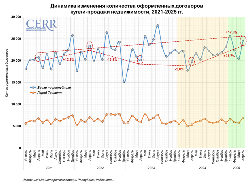 В апреле 2025 года в Узбекистане на рынке недвижимости продажи выросли на 20%, превысив 24 тыс операций, следует из данных ЦЭИР.