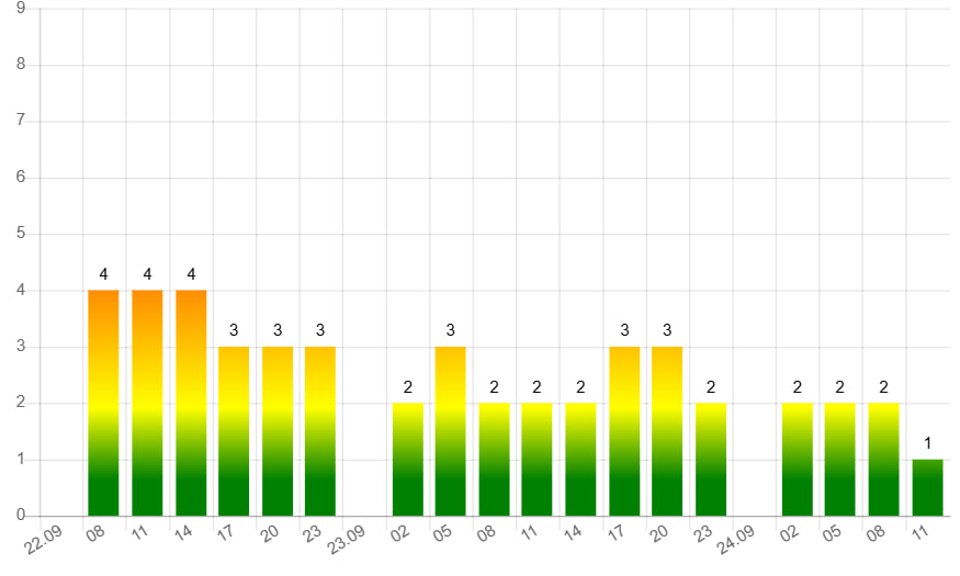 Согласно информации, сила геомагнитных возмущений составит 4 балла. Геоудары ожидаются до 14:00, после этого показатель опустится до 3 баллов. К 23 сентября интенсивность бури снизится до 3 баллов.