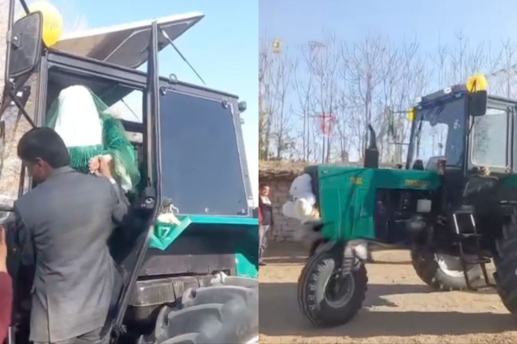 В соцсетях распространилось видео, где, предположительно, в Сурхандарьинской области устроили свадебный кортеж из новеньких тракторов марки «Белорус». Главный из них, где сидели молодожены, украсили шарами и игрушечным медведем.